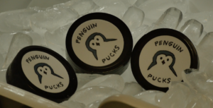 2 hand-made penguin pucks and 1 neoprene Penguin Puck coozie!